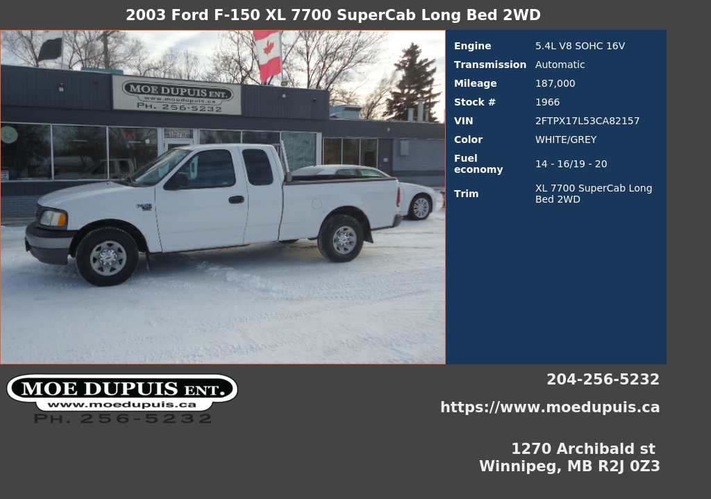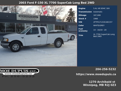 LOOKING FOR A NICE CLEAN OLDER RUST FREE WORK TRUCK? THEN HERE IT IS! PERFECT DELIVERY VEHICLE! ONLY 187 000KMS!! V8 AUTOMATIC WITH AIR!! NOTHING FANCY ! JUST A GOOD OLD FASHION WORK TRUCK!! JUST SAFETIED AND SERVICED!! READY FOR YOU FOR ONLY $9986 PLUS PST AND GST! WARRANTY IS AVAILABLE!! VIEW @ MOE DUPUIS ENTERPRISE INC. CONVENIENTLY LOCATED @ 1270 ARCHIBALD ST. ONE BLOCK NORTH OF FERMOR OR CALL BRYAN @ 204 941 9080 OR 24/7 @ WWW.MOEDUPUIS.CA DEALER #4194