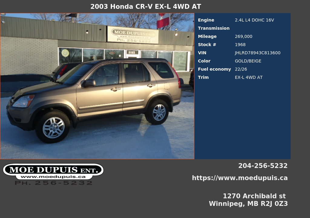 MUST BE SEEN AND DRIVEN!!! ALWAYS SERVICED @ THE HONDA STORE!! ANOTHER 100 % PERCENT RUST FREE WEST COAST SUV!! TOP OF THE LINE IN 2003 !! LEATHER SUNROOF AND MORE!! TRUE IMPORT !! BUILT IN JAPAN!! ALL HIGHWAY KMS !! IN EXTRA CLEAN CONDITION FOR THE YEAR!! JUST SAFETIED AND SERVICED!! READY FOR YOU FOR ONLY $9,986 PLUS PST AND GST! WARRANTY IS AVAILABLE!! VIEW THIS RARE FIND @ MOE DUPUIS ENTERPRISE INC. CONVENIENTLY LOCATED @ 1270 ARCHIBALD ST. ONE BLOCK NOTH OF FERMOR OR CALL BRYAN @ 204 256 5232 OR 204 941 9080 OR 24/7 @ WWW.MOEDUPUIS.CA DEALER #4194