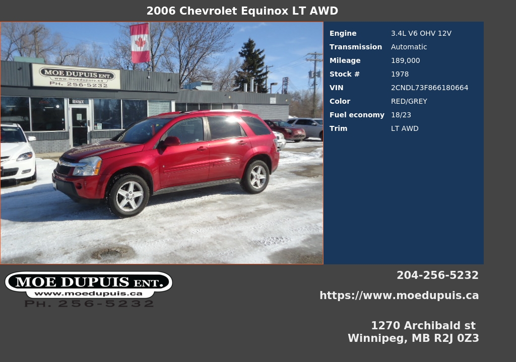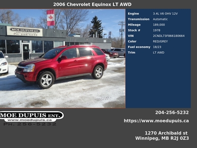 2006 CHEVROLET EQUINOX LT ALL WHEEL DRIVE!! LEATHER LOADED!! ONLY 189 000KMS!! NOT HIGH FOR THE YEAR! RUNS AND DRIVE GREAT!! A FEW BUMPS AND BRUISES!! JUST SAFETIED AND SERVICED!! ON SALE NOW FOR ONLY $6,986 PLUS PST AND GST! WARRANTY IS AVAILABLE!! VIEW @ MOE DUPUIS ENTERPRISE INC. CONVENIENTLY LOCATED @ 1270 ARCHIBALD ST. ONE BLOCK NORTH OF FERMOR OR CALL BRYAN @ 204 256 5232 OR 204 941 9080 OR 24/7 @ WWW.MOEDUPUIS.CA DEALER #4194