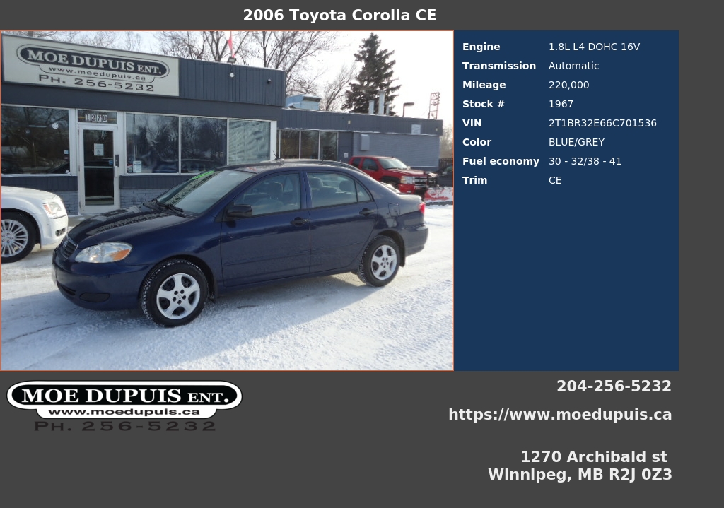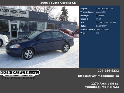 LOOKING FOR A DEPENDABLE ECONOMICAL VEHICLE? THEN LOOK NO MORE!! BEAUTIFUL RUST FREE OLD SCHOOL COROLLA CE!! AMAZING CONDITION FOR THE YEAR!! 4CYL AUTOMATIC WITH AC AND PDL!! NOTHING FANCY NO HIGH TECH STUFF TO BREAK!! PERFECT FIRST CAR!! JUST SAFETIED AND SERVICED!! READY FOR YOU FOR ONLY $ 9986 PLUS PST AND GST! VIEW @ MOE DUPUIS ENTERPRISE INC. CONVENIENTLY LOCATED @ 1270 ARCHIBALD ST. ONE BLOCK NORTH OF FERMOR OR CALL BRYAN @ 204 256 5232 OR 204 941 9080 OR 24/7 @ WWW.MOEDUPUIS.CA DEALER #4194