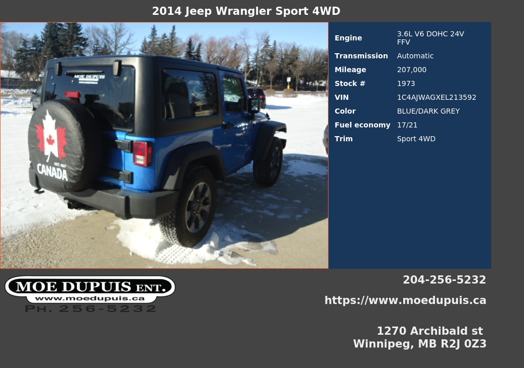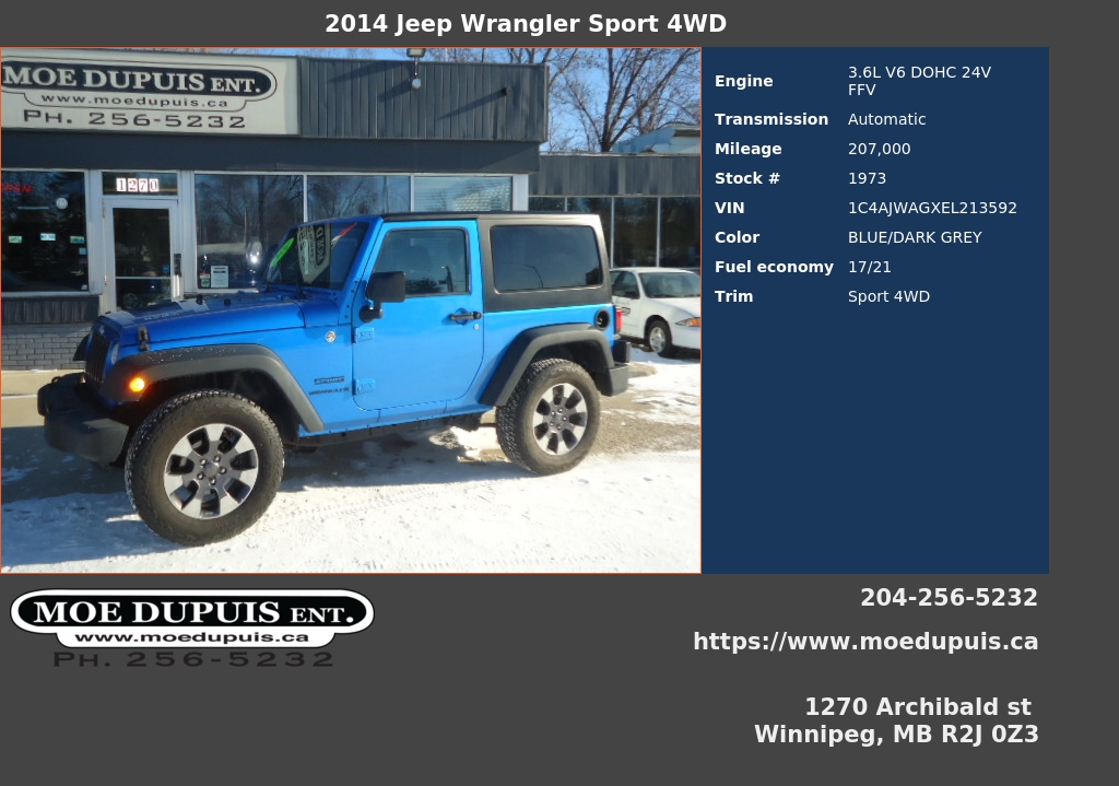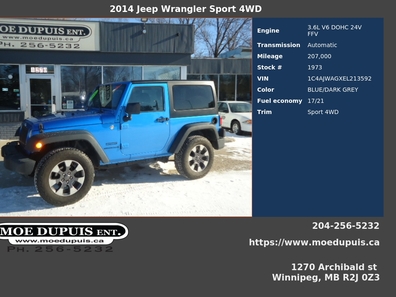 EXTRA CLEAN !ONE OWNER ! ACCIDENT FREE !2014 JEEP WRANGLER HARDTOP 2 DOOR SPORT! 3.6 LITRE PENTASTAR V6 6 SPEED MANUAL CRUISE TILT CD!! NOTHING FANCY !! BUT HEY ITS A JEEP!!! JUST SAFETIED AND SERVICED!! READY FOR YOU FOR ONLY $14,986 PLUS PST AND GST!! WARRANTY AND VARIOUS FINANCING OPTIONS AVAILABLE OAC. VIEW @ MOE DUPUIS ENTERPRISE INC. CONVENIENTLY LOCATED @ 1270 ARCHIBALD ST. ONE BLOCK NOTH OF FERMOR OR CALL BRYAN @ 204 256 5232 OR 204 941 9080 OR 24/7 @ WWW.MOEDUPUIS.CA DEALER #4194