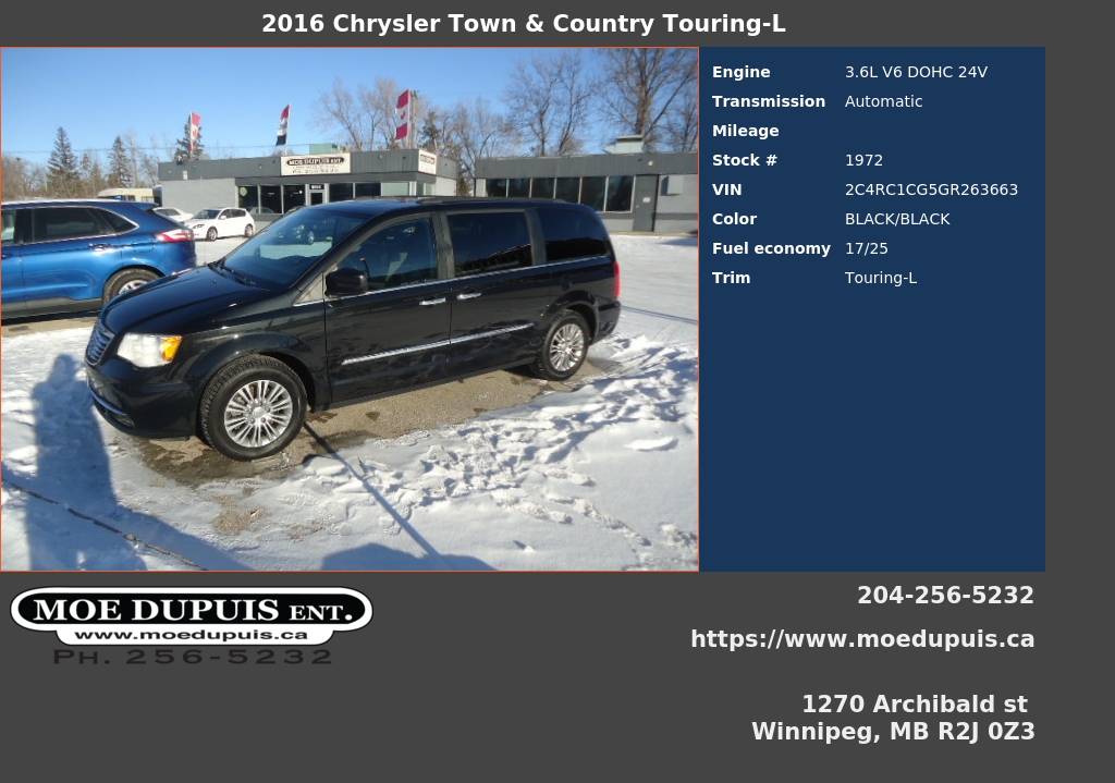 MUST BE SEEN AND DRIVEN!! VERY WELL CARED FOR FULLY LOADED FAMILY HAULER!! ITS GOT ALL THE GOODIES!! JUST ARRIVED FROM THE WEST COAST!! SO YES OF COURSE RUST FREE!! BLACK ON BLACK!! 201 000KMS!! JUST SAFETIED AND SERVICED!! READY FOR YOU FOR ONLY $14,986 PLUS PST AND GST! WARRANTY AND VARIOUS FINANCING OPTIONS AVAILABLE OAC! VIEW @ MOE DUPUIS ENTERPRISE INC. CONVENIENTLY LOCATED @ 1270 ARCHIBALD ST. ONE BLOCK NORTH OF FERMOR OR CALL BRYAN @ 204 256 5232 OR 204 941 9080 OR 24/7 @ WWW.MOEDUPUIS.CA DEALER #4194